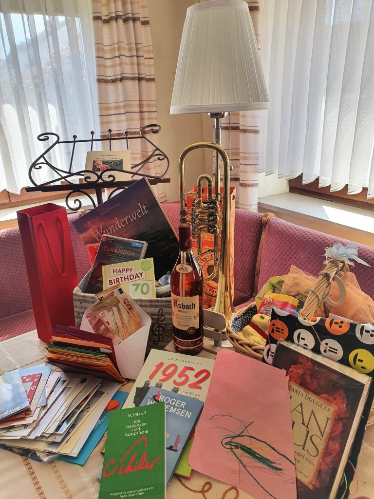 Danksagung für die überwältigende Anteilnahme an meinem 70. Geburtstag Danke für Eure wunderschönen, weisen, wertschätzenden und witzigen Wünsche, die außerordentlich gut gefüllten Hometrainer-Kuverts und die schönen wohlbedachten und wohlschmeckenden Präsente! Besonderen Dank dem Posaunenchor für sein schönes Spiel und meiner Familie für's 'ganze Dromrom'! Ich freue mich jetzt schon auf meinen 80er und grüße Euch alle mit einem dreifach-donnernden 'Auf's Leaba!'. Euer Hans (noch immer ganz aus dem Häusle!).