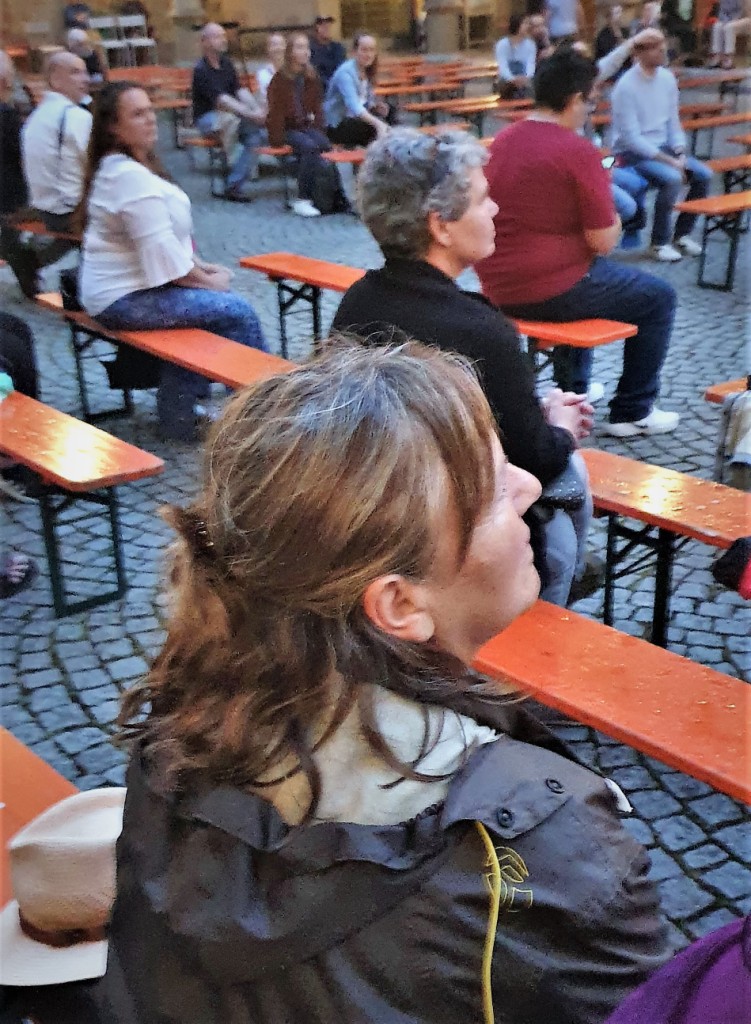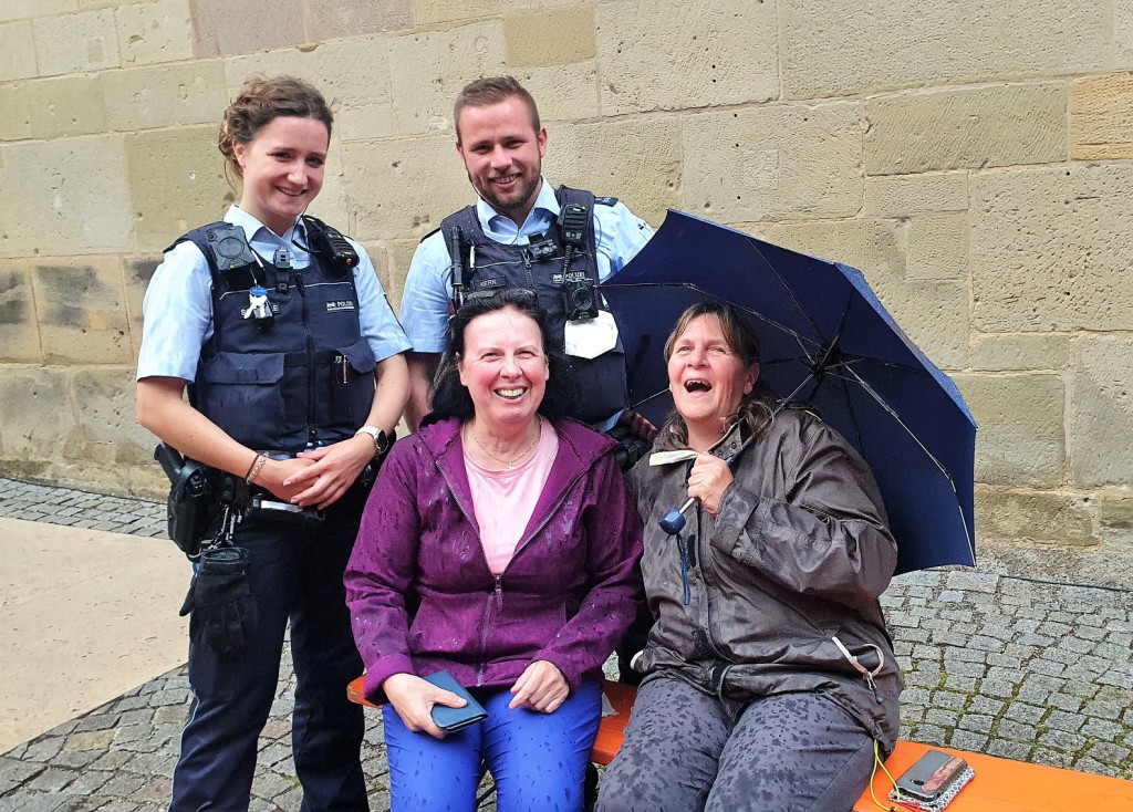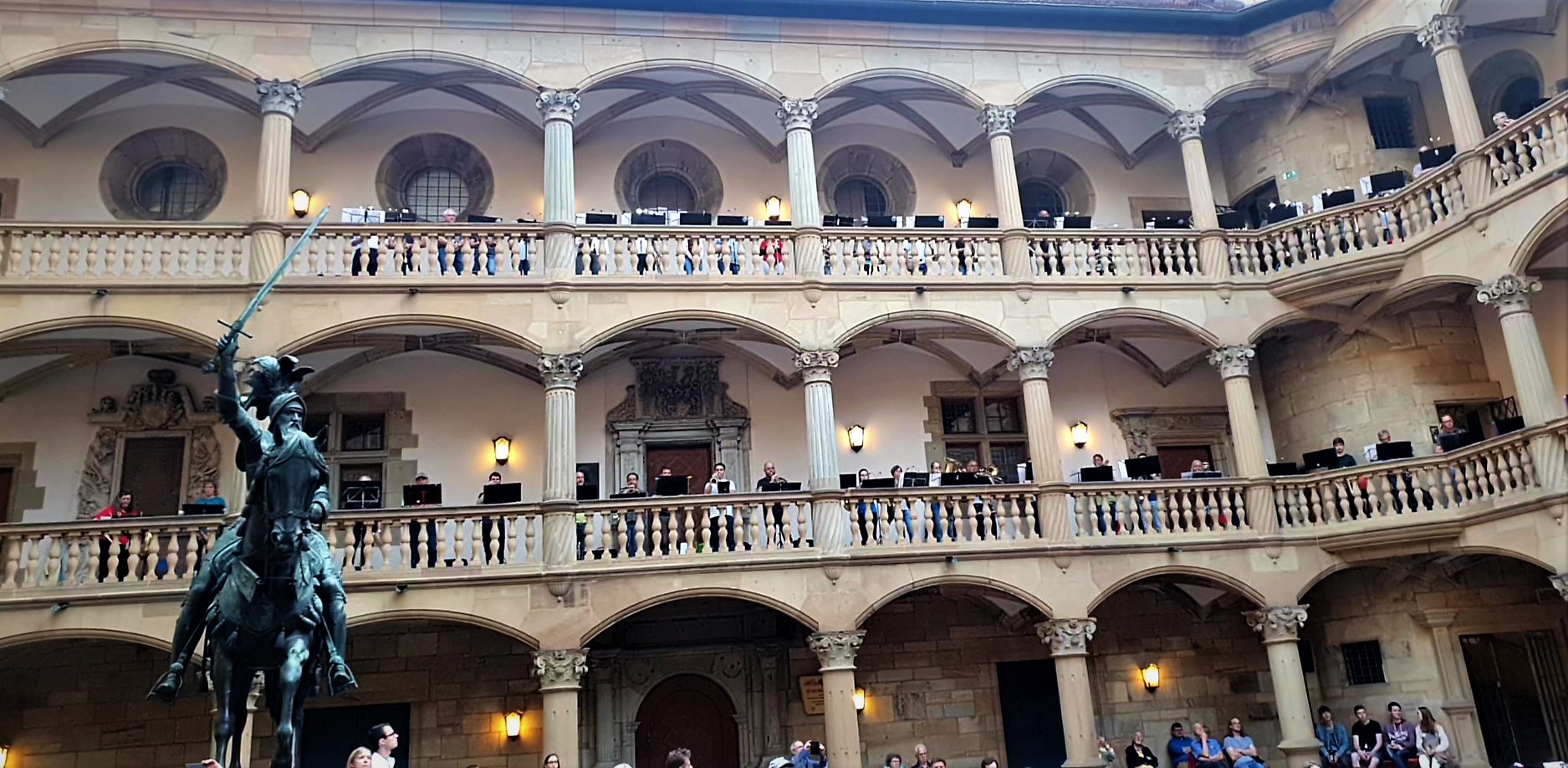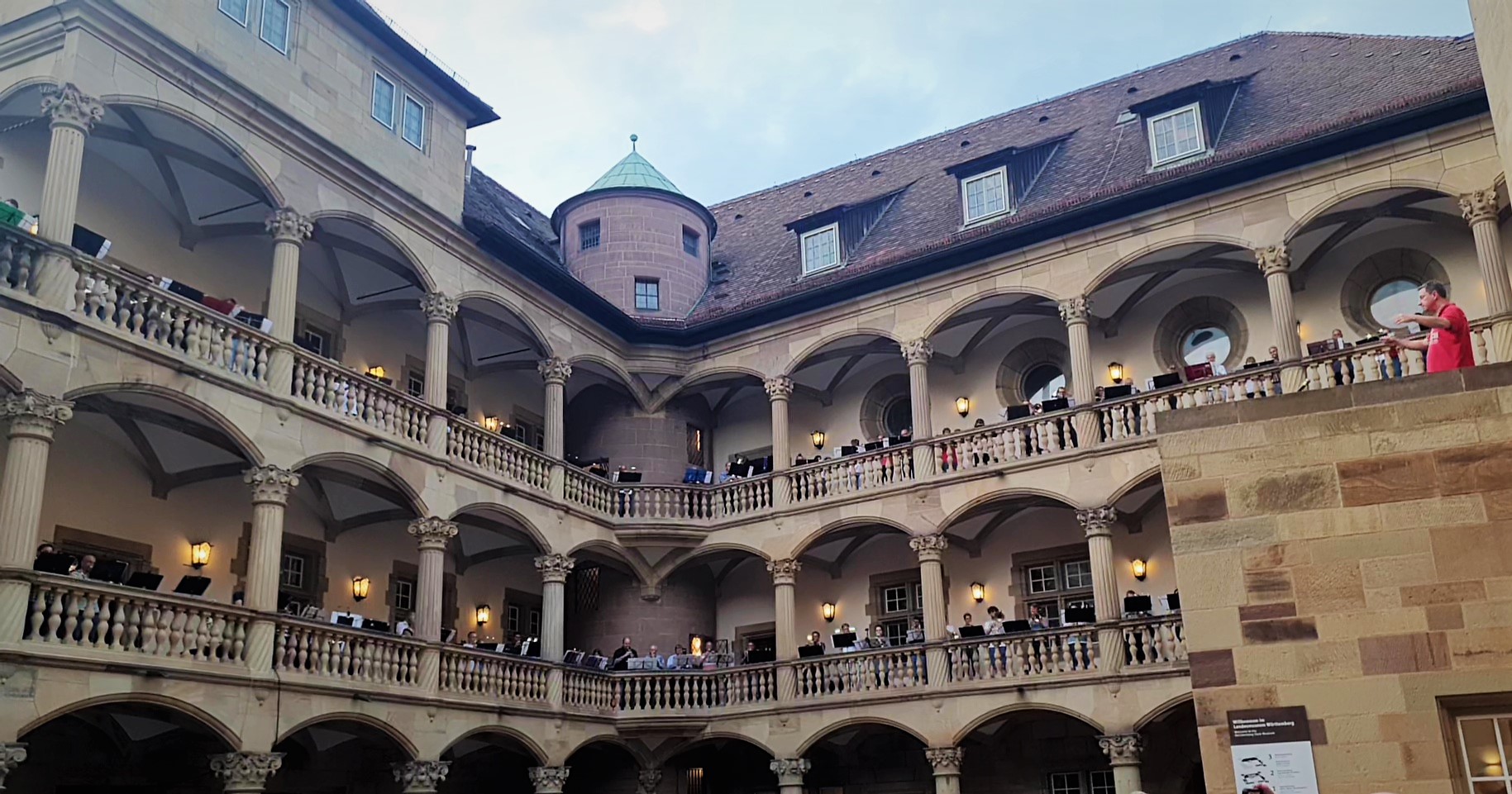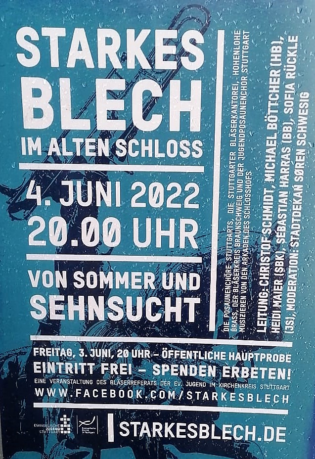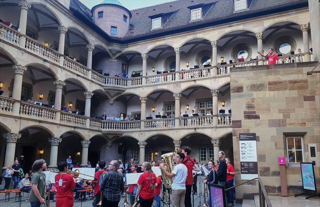 Eine kleine aber feine Delegation besuchte mittels 9-Euro-Ticket das Stuttgarter Posaunen-Event ‚Starkes Blech im Alten Schloß‘ und genoss den einmaligen Klang der ringsum auf den Arkaden des Innenhofes musizierenden Bläser/innen. Überraschung: als besonderen Service stellten die Veranstalter ihre ländlichen Ehrengäste vorsichtshalber unter Polizeischutz!