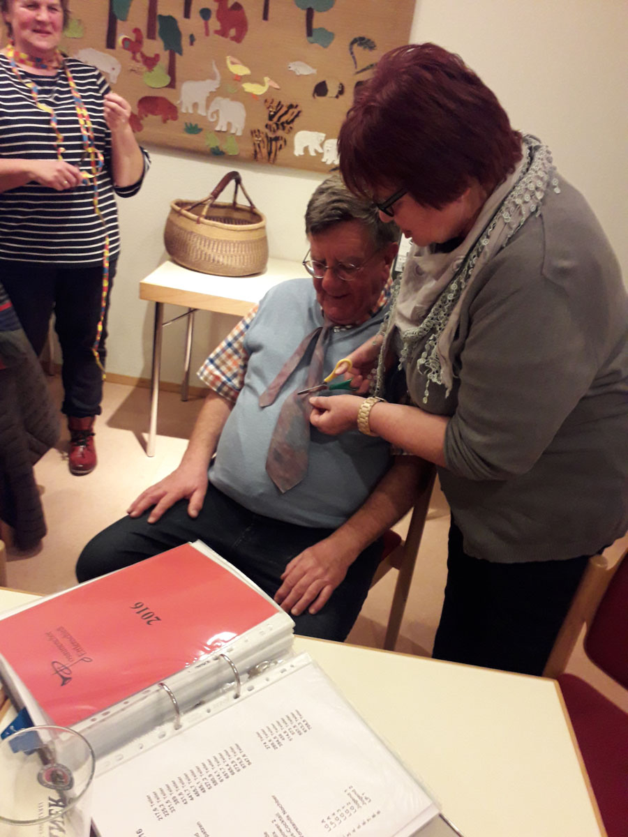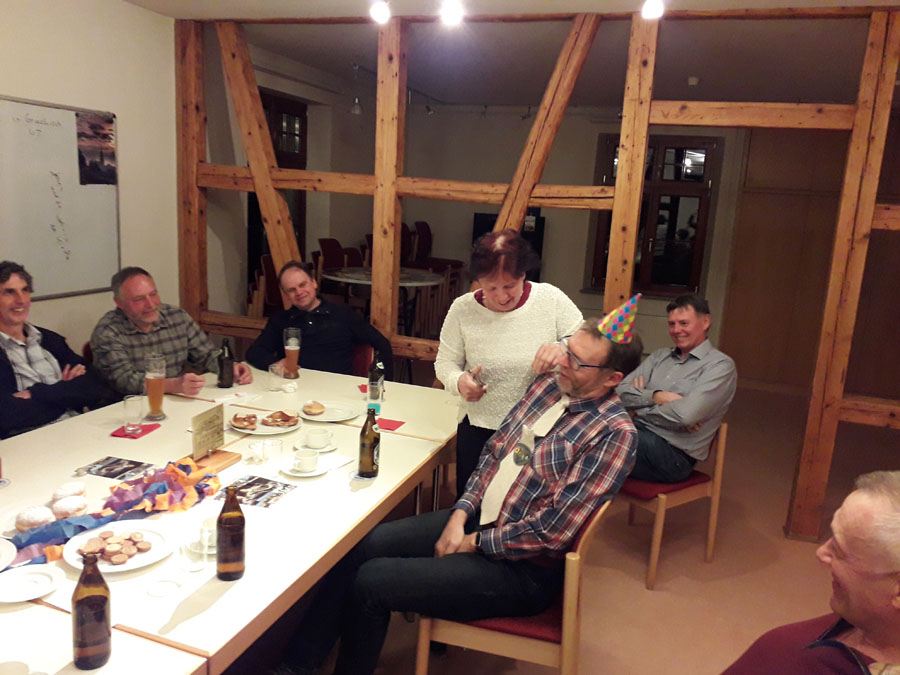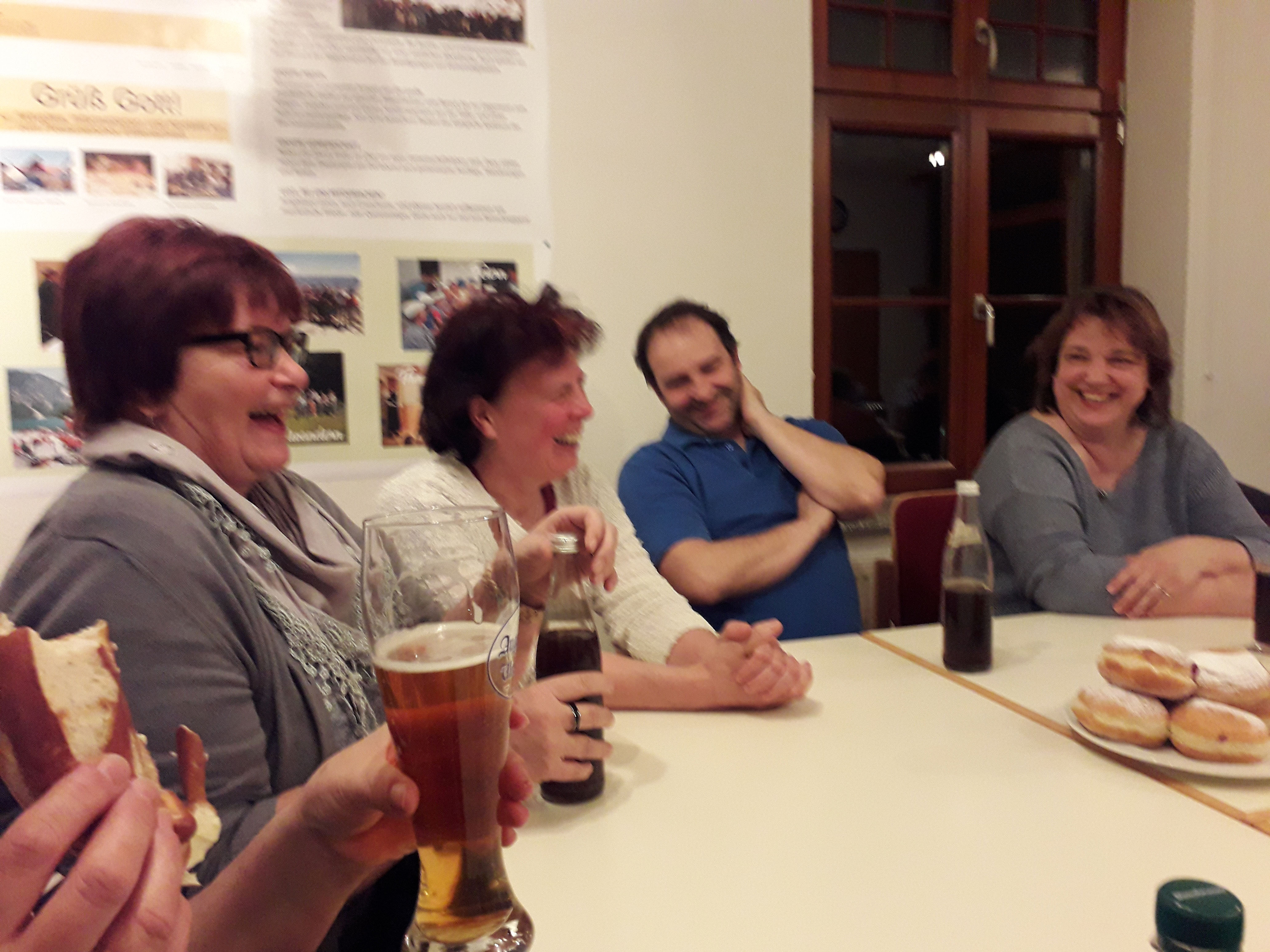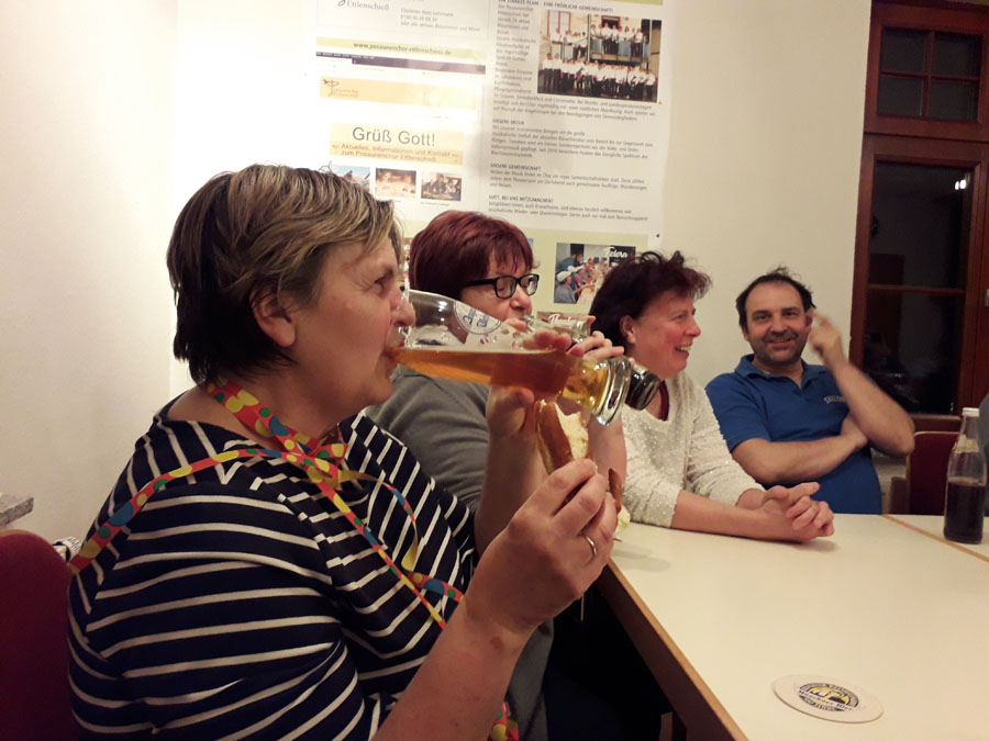Waren unsere glombigen Proben bisher ein gemütliches Brezel- und Berlineressen mit eher pflichtschuldigem Krawatten-Abschneiden, so artete die diesjährige in eine regelrechte Orgie aus. Als die männlichen Probenteilnehmer halb verlechnet die Klingende Posaune erreichten, empfing sie eine Rädelsführerin des weiblichen Rudels mit der Drohung: „Heute überschreiten wir alle Grenzen!“ Und alle ihre Artgenossinnen setzten die Worte in Taten um. Ob es an den ominösen türkisblauen Gebräuen lag, die der Chorleiter noch vom Jahresabschluss foil hatte? Eines ist jedenfalls sicher: Sogar die artigsten der Posaunenweiber entwickelten an diesem Abend eine beängstigende Vorliebe für Spitzla aller Art, insbesondere natürlich für das Abschneiden derselben. Und nur mit Mühe konnten sie von einer Vorführung des Ententanzes abgehalten werden. Allerdings: dass die Herrn der Schöpfung behaupteten, die Noten seien so gut wie griffbereit und sie würden das vom Blatt lässig spielen, half auch nicht gerade, die aufgeheizte Stimmung zu beruhigen. So kann man von Glück sagen, dass folgendes Sprichwort – selbstredend ohne ein Wimpernzucken vorgetragen von einer Dame – nicht noch in die Tat umgesetzt wurde: „Es steckt ebbes Guats en jedam Ma, ond seis bloß a Kuchemesser.“