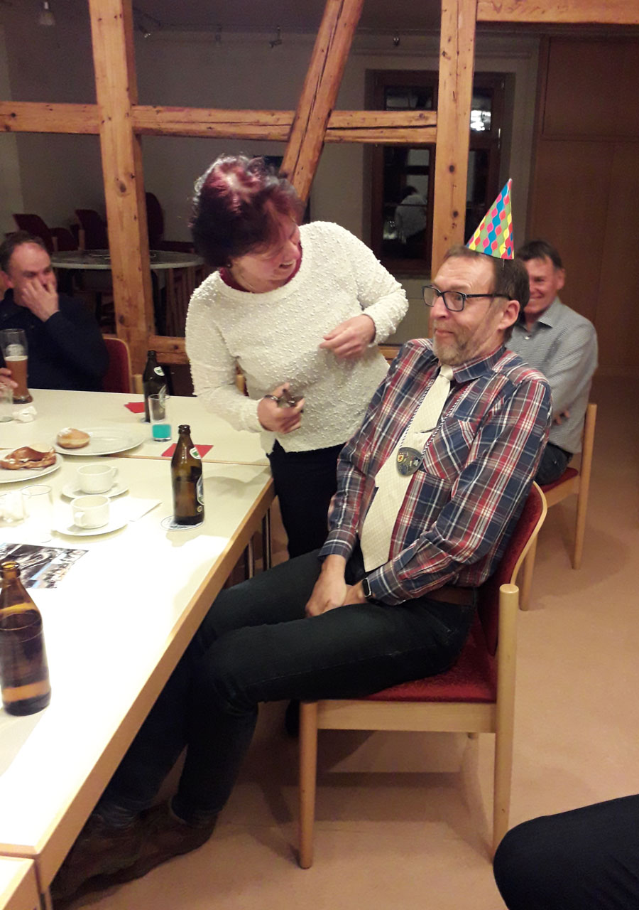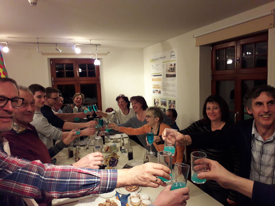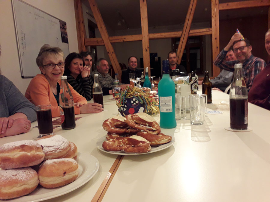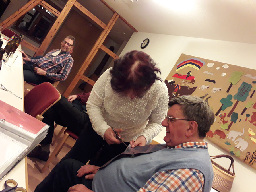 Waren unsere glombigen Proben bisher ein gemütliches Brezel- und Berlineressen mit eher pflichtschuldigem Krawatten-Abschneiden, so artete die diesjährige in eine regelrechte Orgie aus. Als die männlichen Probenteilnehmer halb verlechnet die Klingende Posaune erreichten, empfing sie eine Rädelsführerin des weiblichen Rudels mit der Drohung: „Heute überschreiten wir alle Grenzen!“ Und alle ihre Artgenossinnen setzten die Worte in Taten um. Ob es an den ominösen türkisblauen Gebräuen lag, die der Chorleiter noch vom Jahresabschluss foil hatte? Eines ist jedenfalls sicher: Sogar die artigsten der Posaunenweiber entwickelten an diesem Abend eine beängstigende Vorliebe für Spitzla aller Art, insbesondere natürlich für das Abschneiden derselben. Und nur mit Mühe konnten sie von einer Vorführung des Ententanzes abgehalten werden. Allerdings: dass die Herrn der Schöpfung behaupteten, die Noten seien so gut wie griffbereit und sie würden das vom Blatt lässig spielen, half auch nicht gerade, die aufgeheizte Stimmung zu beruhigen. So kann man von Glück sagen, dass folgendes Sprichwort – selbstredend ohne ein Wimpernzucken vorgetragen von einer Dame – nicht noch in die Tat umgesetzt wurde: „Es steckt ebbes Guats en jedam Ma, ond seis bloß a Kuchemesser.“