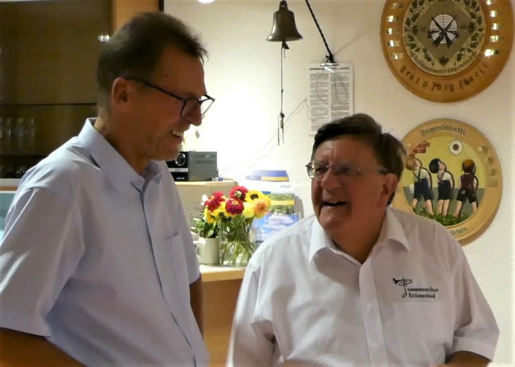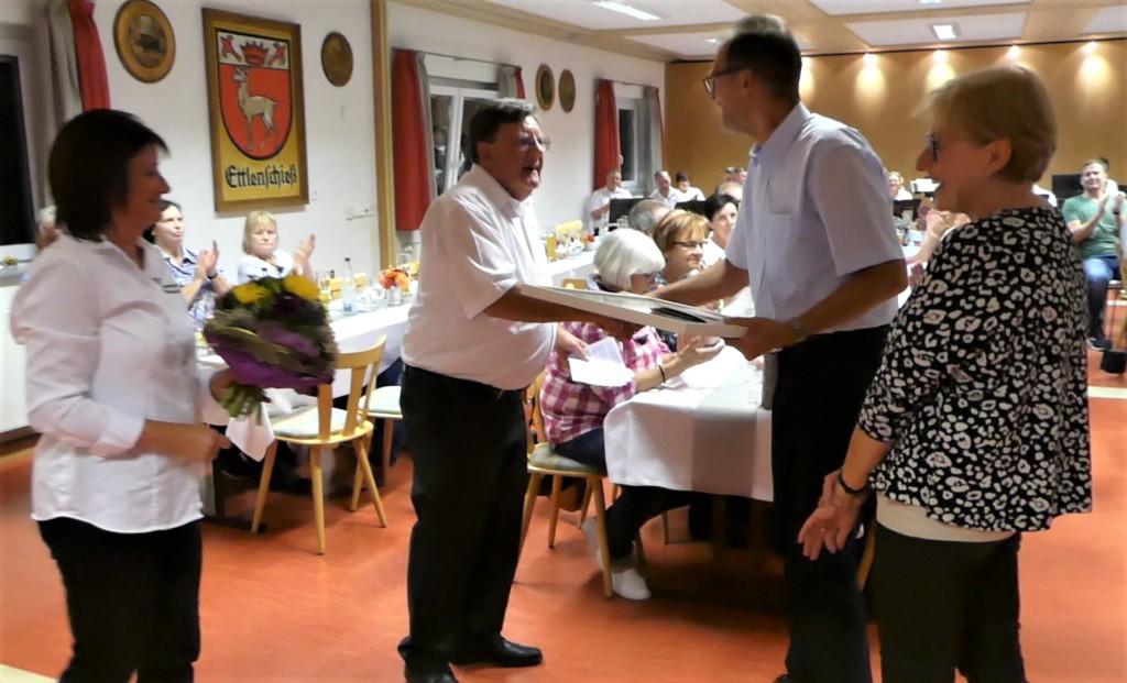 So gebrieft wurde 10 Jahre nach seinem ‚Supergau‘ am 12.09. mit (den ausdrücklich gewünschten) Pauken und Trompeten ein rauschendes Fest gefeiert, bei dem auch der Dank des Chores an unseren rüstigen Vorsitzenden und mit Recht stolzen Jubelbräutigam samt Gattin nicht zu kurz kommen durfte.