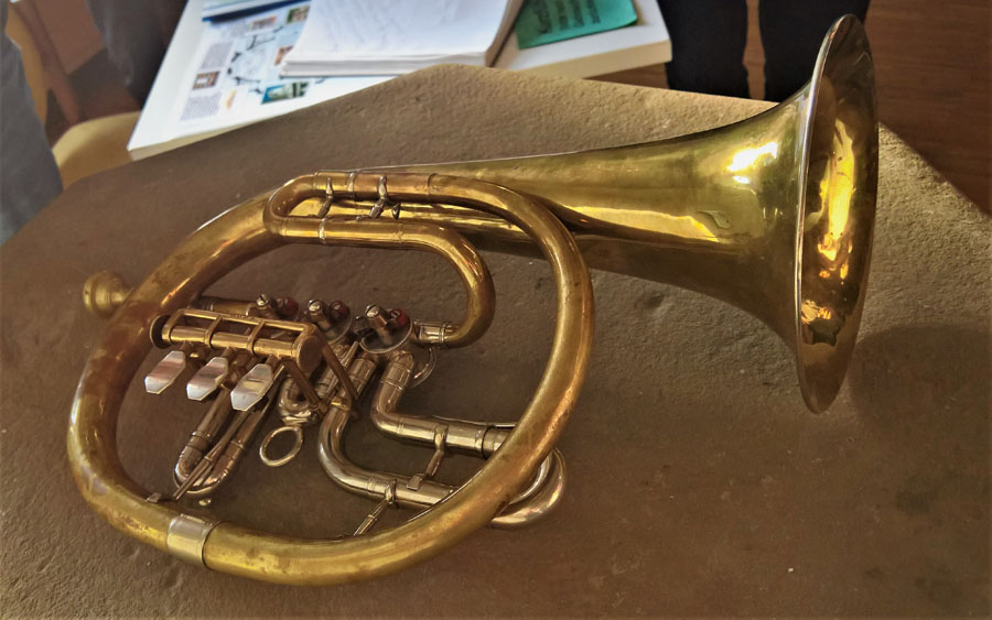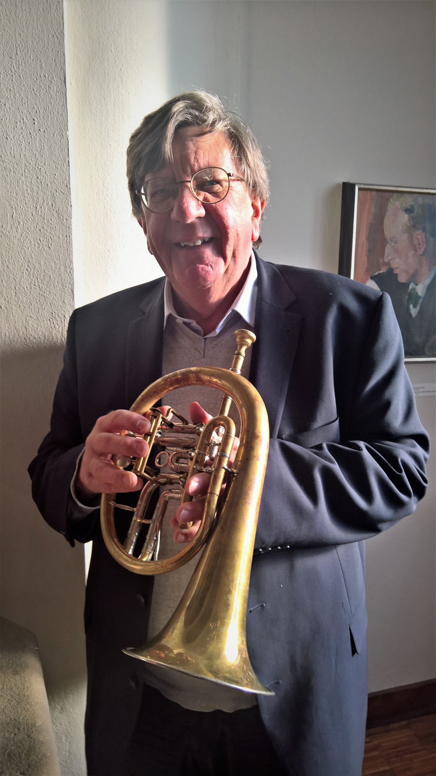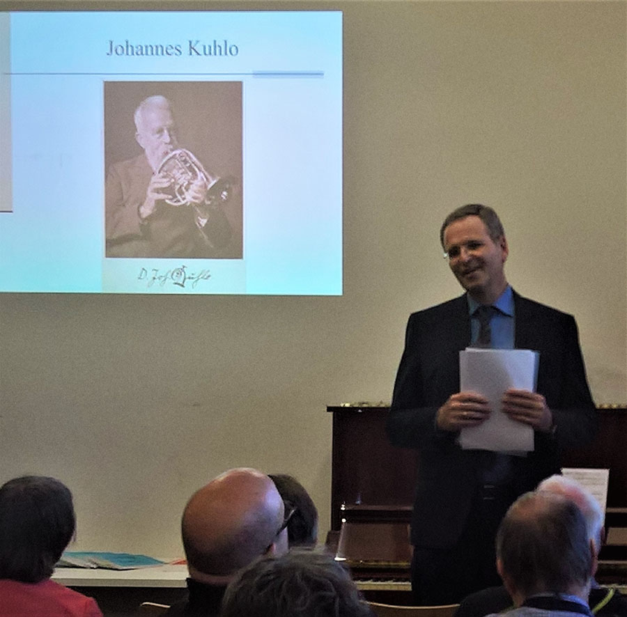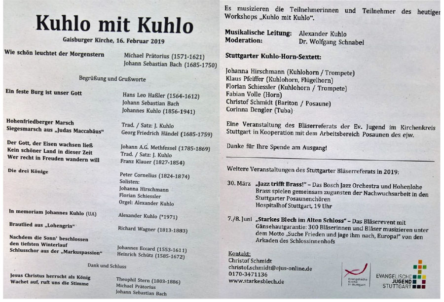 Die musikalische Leitung des Tages hatte dessen Urenkel Alexander Kuhlo, er ist Kirchenmusiker in Zuffenhausen. Im praktischen Teil der Veranstaltung vergriff sich unsere Gesandtschaft an einem originalen Instrument und trug beim Schlusskonzert in der Gaisburger Kirche hoffentlich das Ihrige zum Hörner-Wohlklang bei, den Johannes Kuhlo so schätzte.